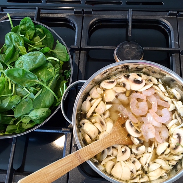 • Add the spinach and some fresh basil in the other pan and stir until the spinach is shrunk.