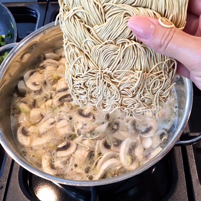 • Add the noodles (egg noodles), they only need to cook for a short time.
