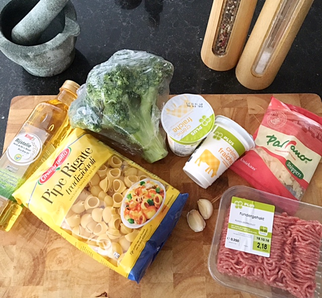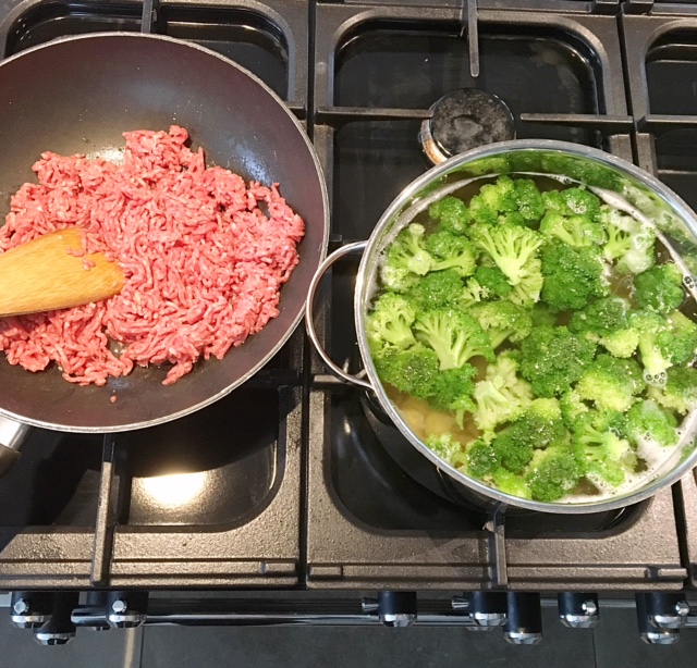 Je hebt voor dit recept maar 2 pannen nodig. In de ene pan kook je de pasta tegelijk met de broccoli in 10 minuten al dente met wat zout. In de koekenpan bak je het gehakt rul in een klein beetje olijfolie. Voeg 2 uitgeperste teentjes knoflook en wat zout aan het gehakt toe.