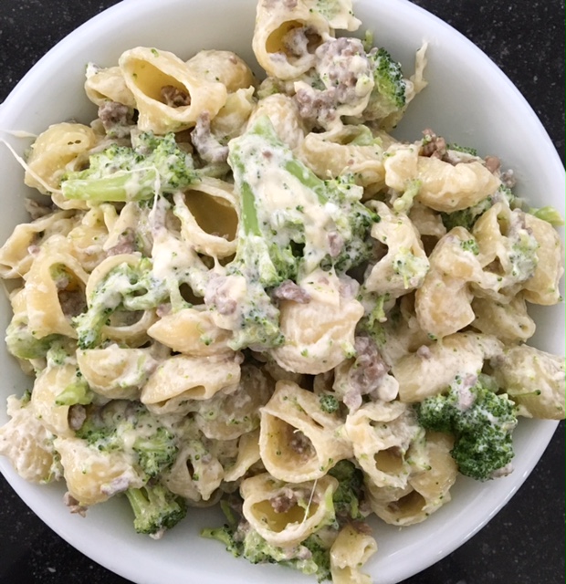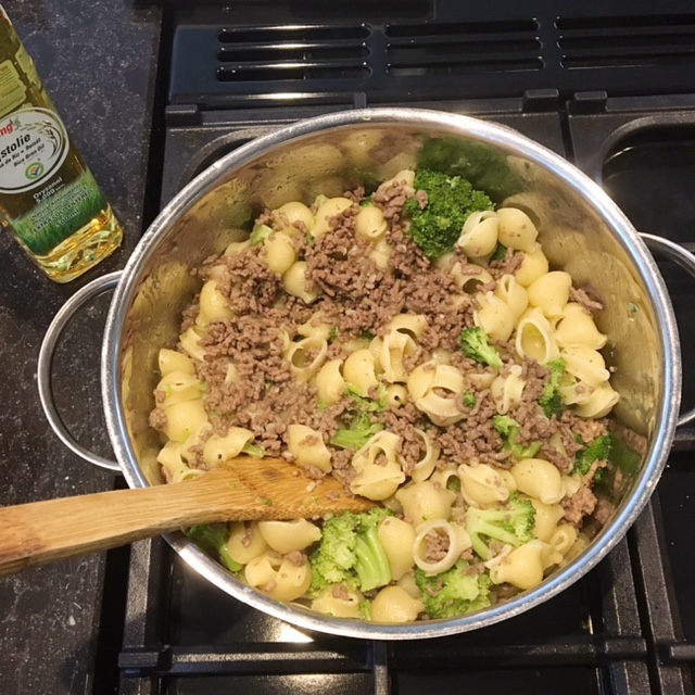 Romige Pasta met Broccoli en Gehakt Giet de pasta en broccoli af. Voeg het rundergehakt toe en meng het goed door elkaar.