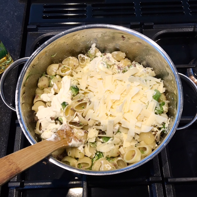 Voeg de crème fraiche en de parmezaanse kaas toe aan het pasta mengsel en roer dit even door op laag vuur.