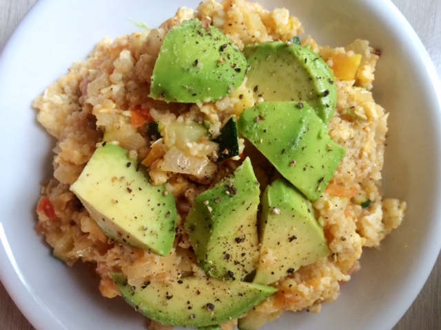 - Add the mixture of onion, garlic, zucchini and tomatoes to the couscous and mix well into the pan.
