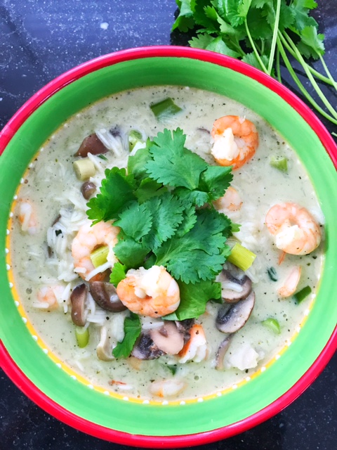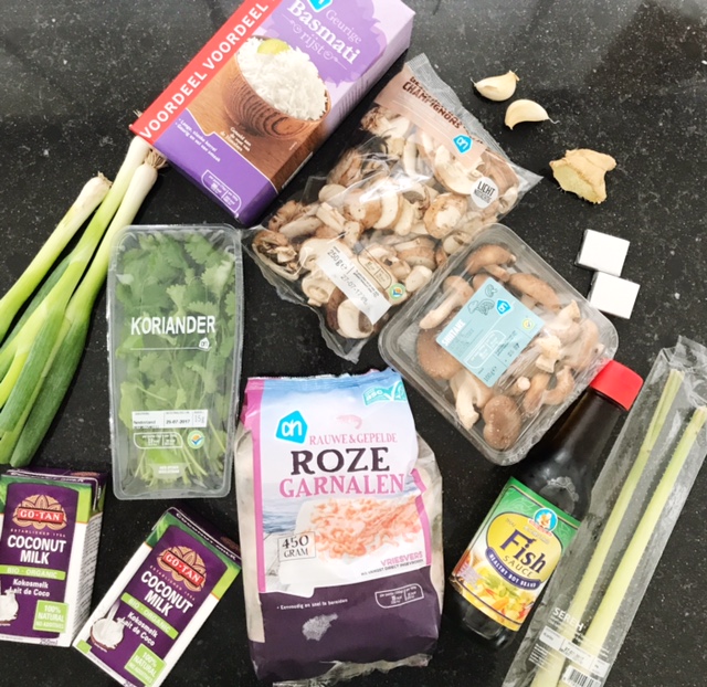 In Asia people eat rice soup for lunch or even for breakfast. The rice soup (Khao Tom) always contains a combination of lemongrass, ginger, coriander and coconut milk. It’s a dish that’s very easy to make because you put everything in one pan and you just have to cook it for a little while. You can make it with pork or chicken, but also with fish. I made the rice soup with shrimp and show you the recipe.