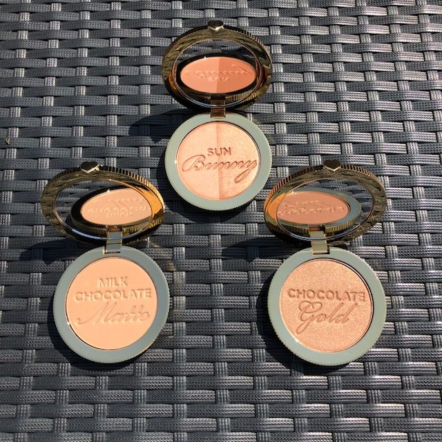 Milk Chocolate is een bestseller bronzer van Too Faced, maar nu met een matte finish. Bevat 100% cacao poeder en blijft lang op de huid zitten. Met de Sun Bunny bronzer creëer je een natuurlijke gloed met een subtiele roze ondertoon. Chocolate Gold is de opvolger van de Chocolate Soleil bronzer, maar dan met glinsterend goud. Bevat ook 100% cacao poeder en blijft lang mooi op de huid.