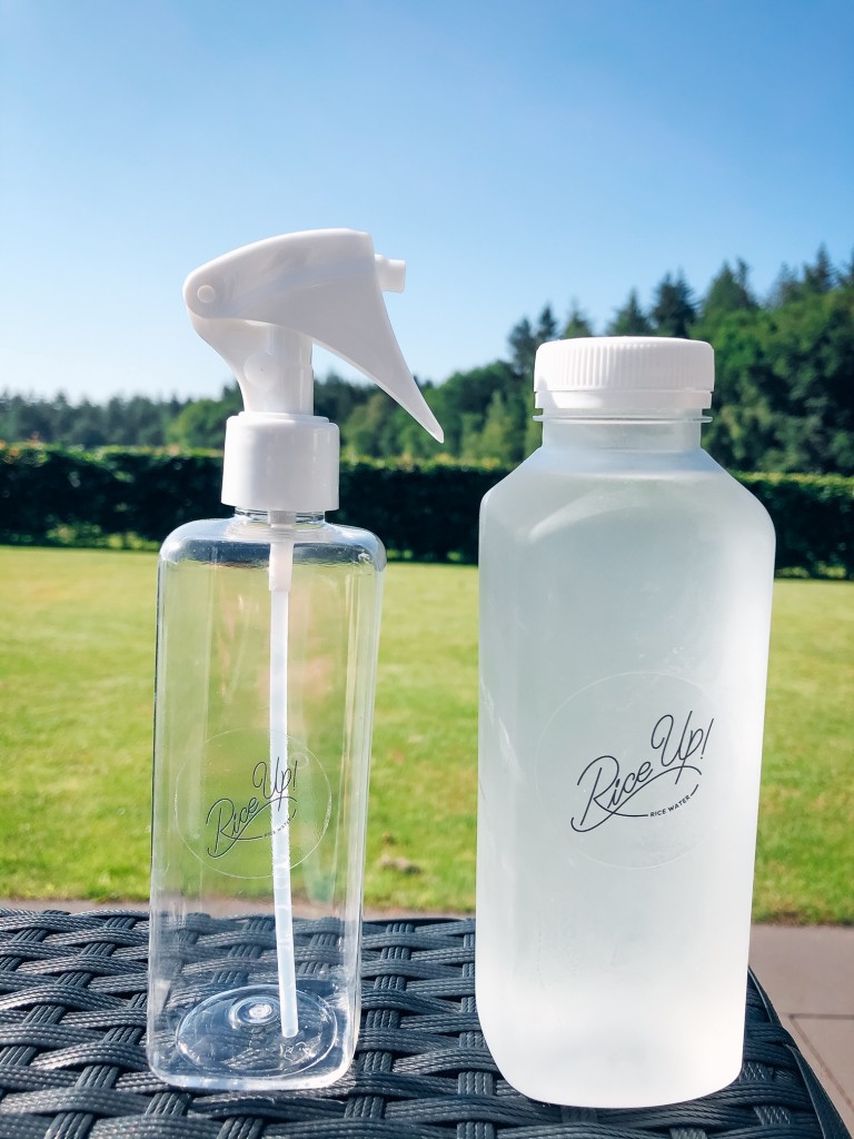 - Vervolgens doe ik een beetje rijstwater in de meegeleverde spray fles en spray het door mijn hele haar. Belangrijk is dat je je hoofdhuid en wortels goed mee neemt.
